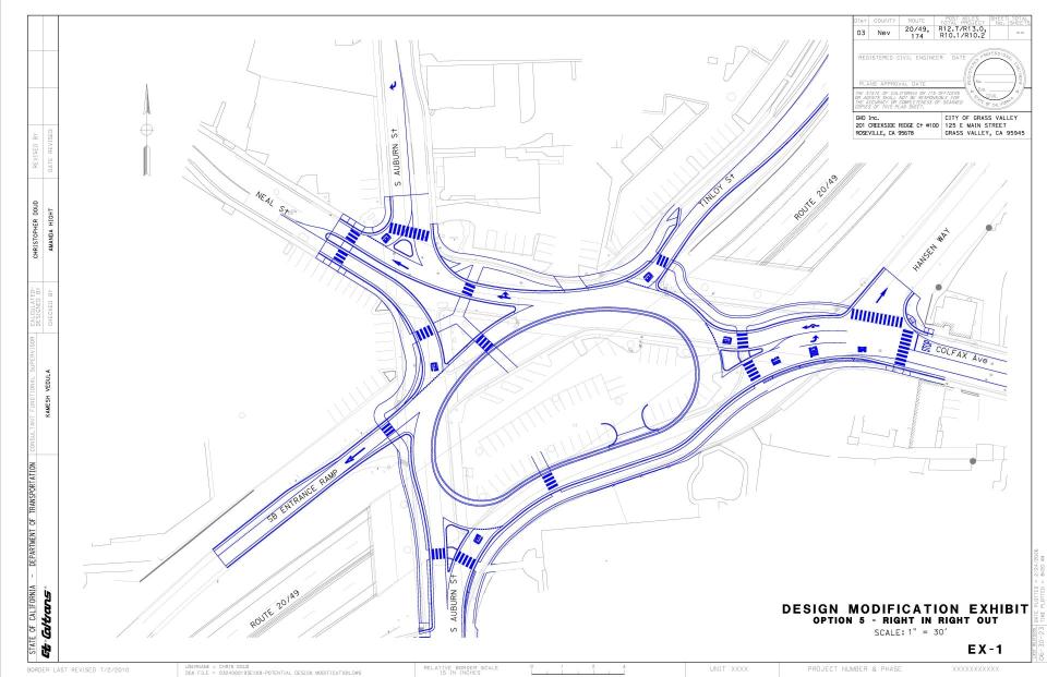 The Downtown GV Roundabout is an oblong shaped roundabout proposed to incorporate the complex signalized intersections of the current “Triangle” into a single large intersection; encompassing the legs of S Auburn St, Colfax Ave, Hansen Way, Tinloy St, Neal St and the State Route 20 onramp.