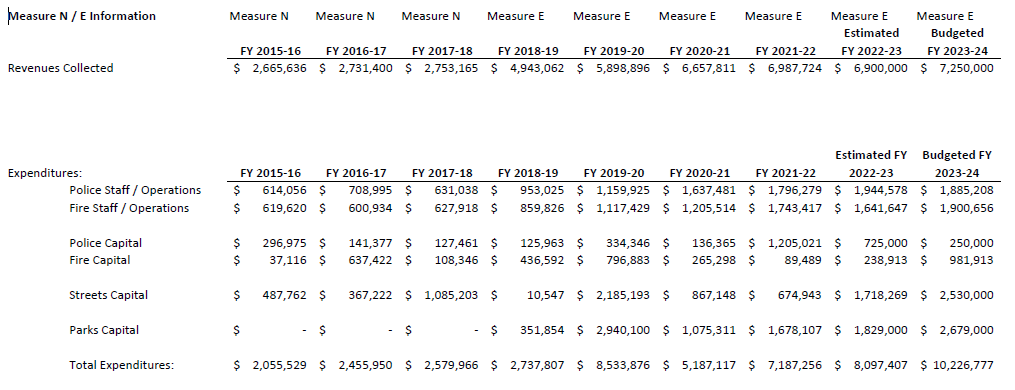 Measure E is a city wide special sales tax of 1%. Originally, a temporary 0.5% sales tax to support fire and police services, Measure N, was passed by voters in 2012. In 2018, Measure N was replaced by the adoption of Measure E, which increased the tax to 1% and made the tax permanent. The adoption of Measure E also expanded the public services the tax supported to include Police, Fire, Park Improvements & Recreation Services, and Street/Sidewalk improvements.