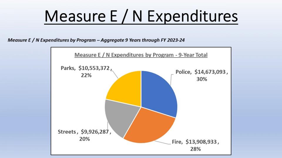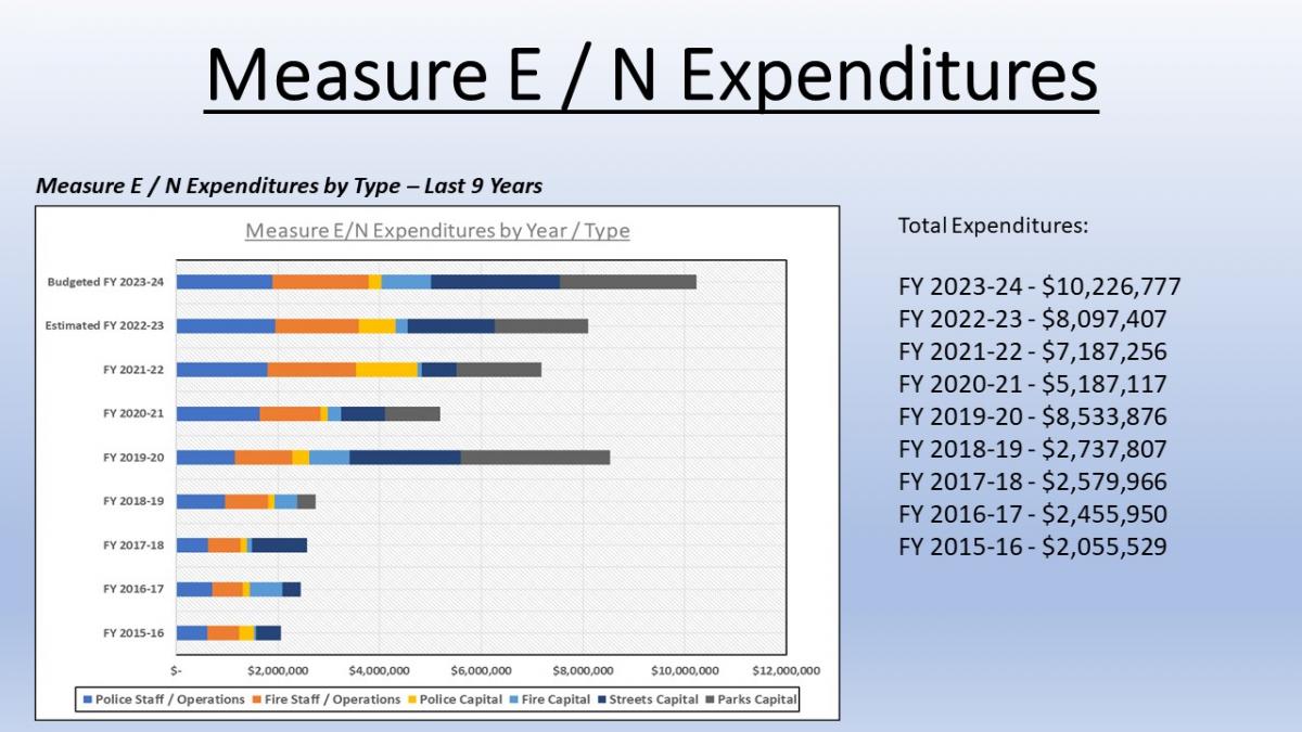 For example, Measure E has funded several new staff for the Police and Fire Departments, a new Ladder Truck for the Fire department and other public safety equipment, the Minnie Park project, the Lyman Gilmore Turf Field, and parts of the street rehabilitation program. Any spending of Measure E funds is approved by this oversight committee and then approved by the City Council.